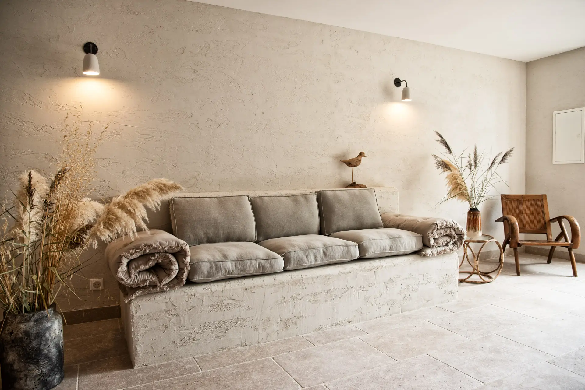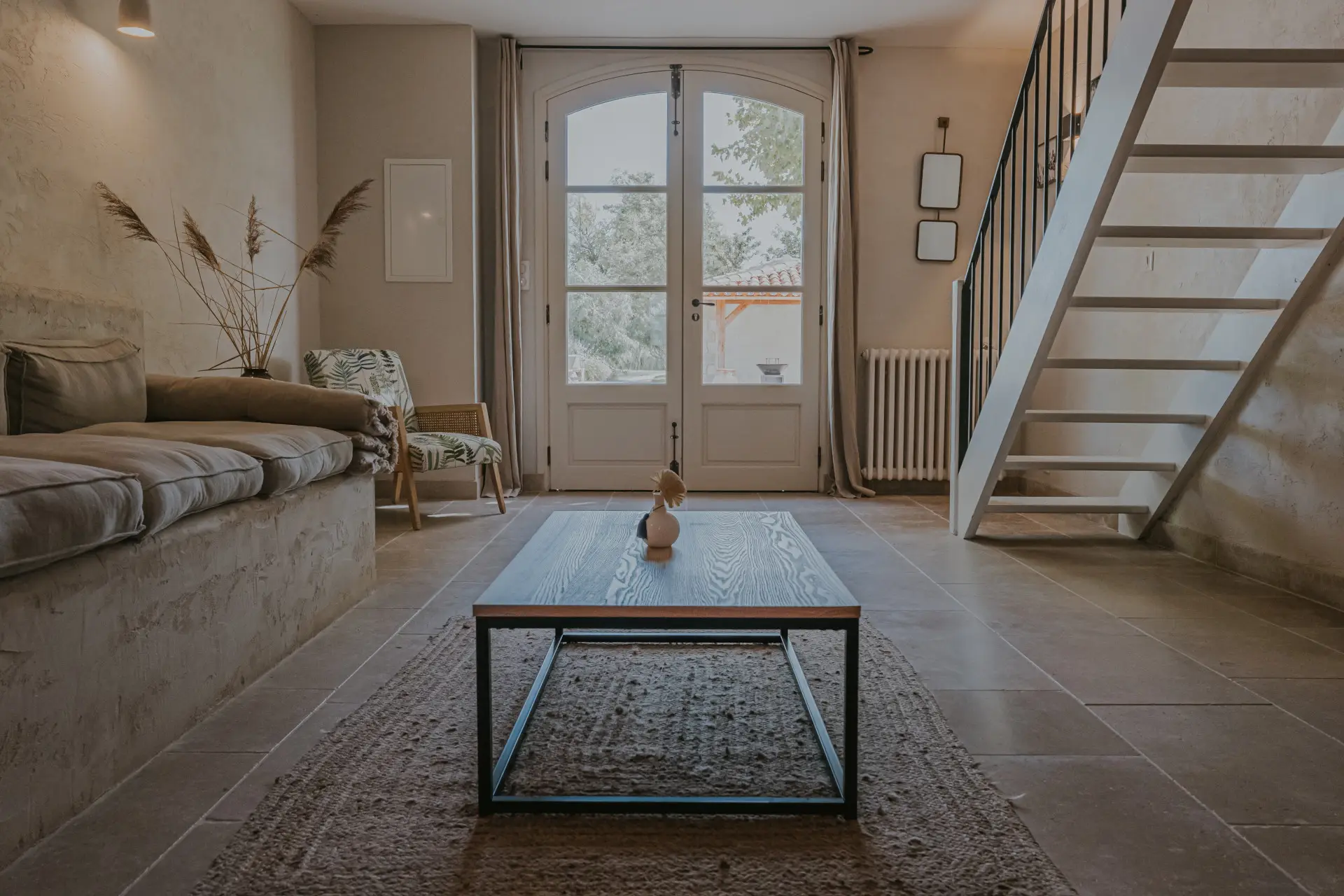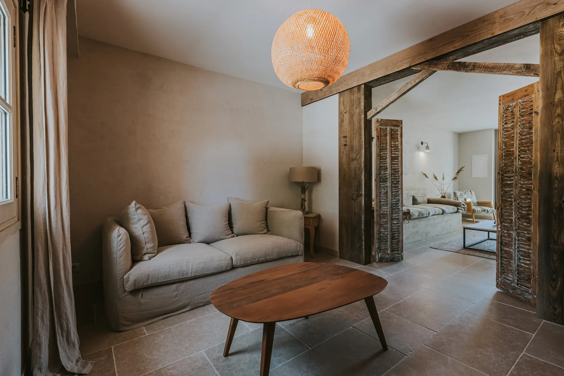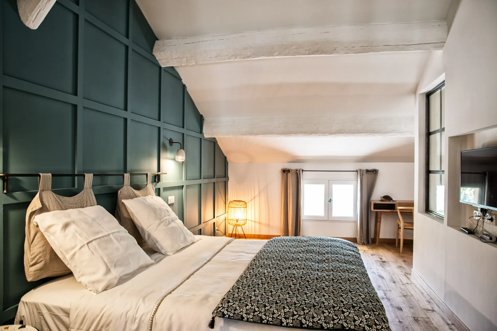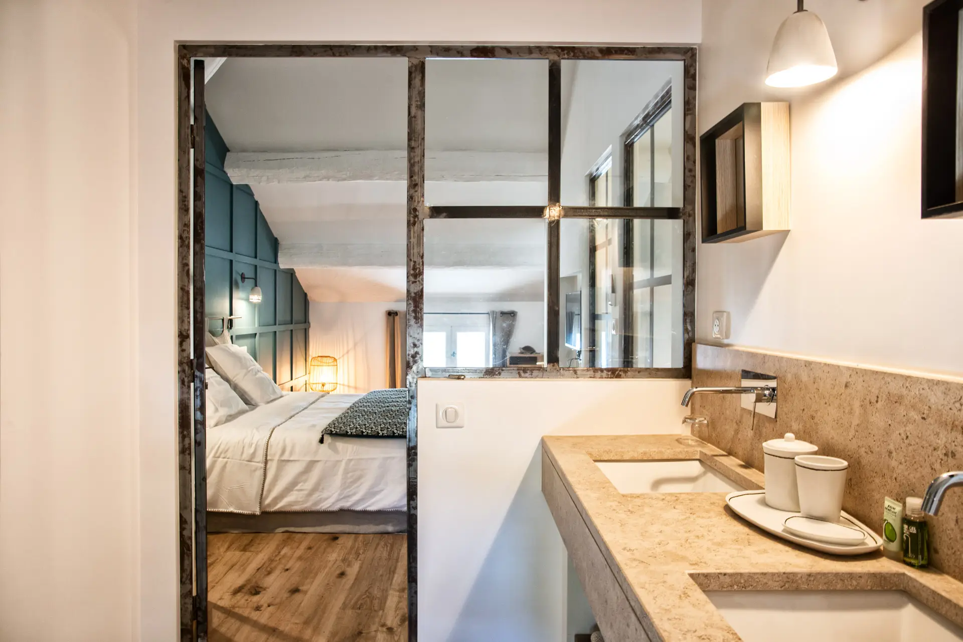 Pensée avec goût, on accède à cette jolie chambre mansardée à l’étage du Mas, par un séjour chaleureux et traversant. La chambre et sa salle de bain communiquent par le biais d’une verrière pleine de charme, laissant passer la lumière et donnant un point de vue réservé sur les prés.